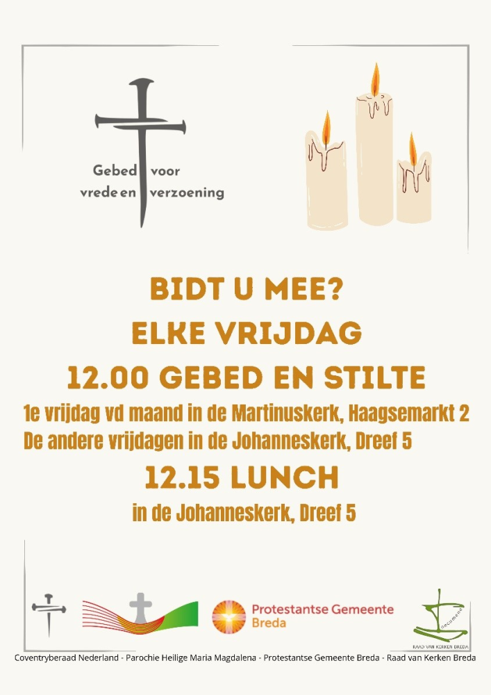 Vanaf deze week houden we iedere vrijdag weer een middaggebed voor vrede en verzoening (het coventrygebed). Er is een netwerk van kerken en kapellen waar frequent, meestal op vrijdag tussen de middag, gebeden wordt voor vrede en verzoening. In Breda deden we dat in de Grote Kerk. Vanaf deze maand is dat in de Martinus- en Johanneskerk met de mogelijkheid om aansluitend te lunchen. We bidden, er is ruimte voor stilte en muziek met daarna gelegenheid om samen te lunchen. Op de eerste vrijdag van de maand komen we voor het gebed samen in de Martinuskerk (Haagse Markt 2, Princenhage), op de overige vrijdagen aan de overkant in Johanneskerk (Dreef 5). De lunch zal steeds worden verzorgd in de Johanneskerk. Iedereen is van harte welkom!